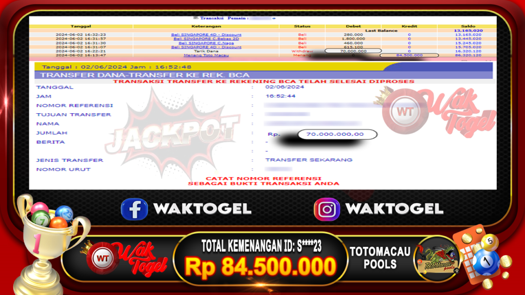 BUKTI PEMBAYARAN TOTOMACAU WAKTOGEL RP. 84.500.000 – GAME : TOGEL TOTOMACAU POOLS TANGGAL (USER ID : S****23) |02-06-2024| CASH LUNAS!