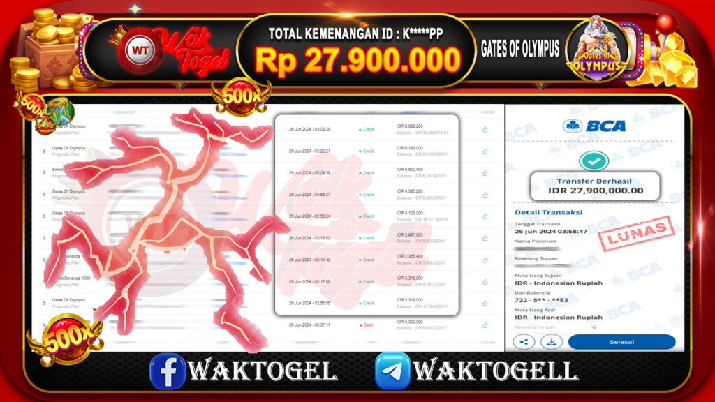 BUKTI PEMBAYARAN SLOT WAKTOGEL RP. 27.900.000 – GAME : SLOT GATES OF OLYMPUS (USER ID : K*****PP) TANGGAL |26-06-2024| CASH LUNAS !