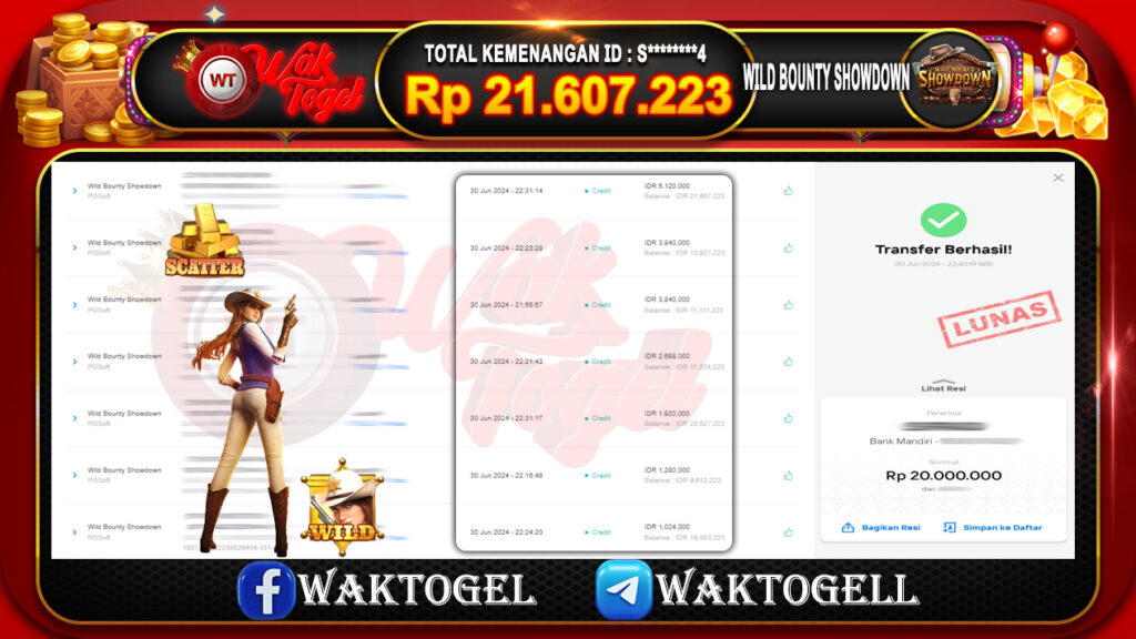 BUKTI PEMBAYARAN SLOT WAKTOGEL RP. 21.607.223 – GAME : SLOT WILD BOUNTY SHOWDOWN (USER ID : S********4) TANGGAL |30-06-2024| CASH LUNAS !