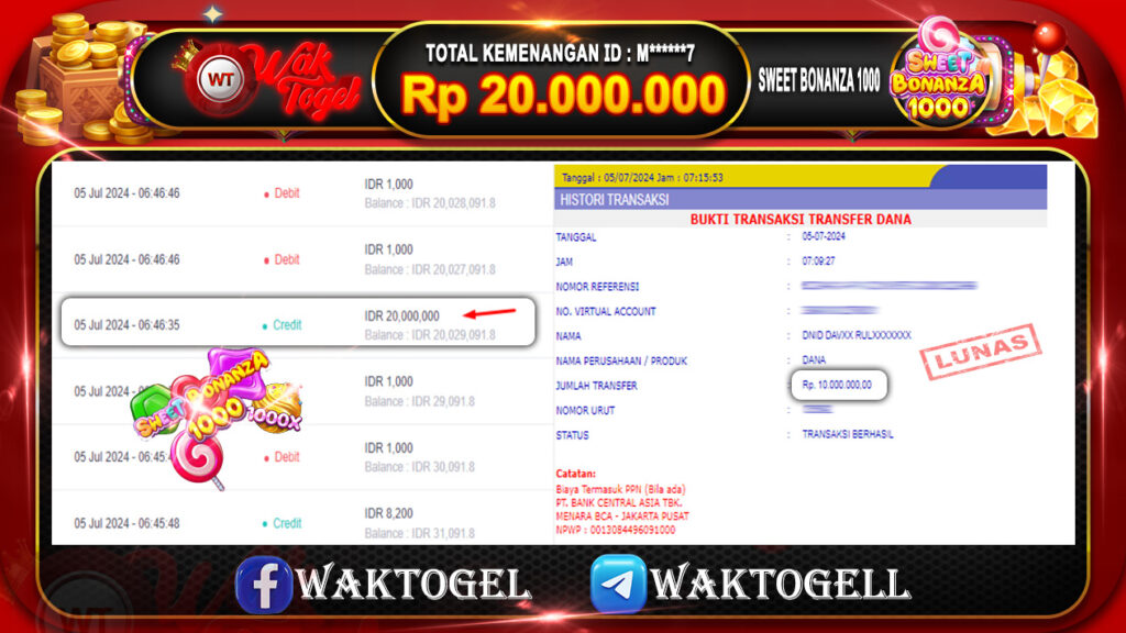 BUKTI PEMBAYARAN SLOT WAKTOGEL RP. 20.000.000 – GAME : SLOT SWEET BONANZA 1000 (USER ID : M******7) TANGGAL |05-07-2024| CASH LUNAS !