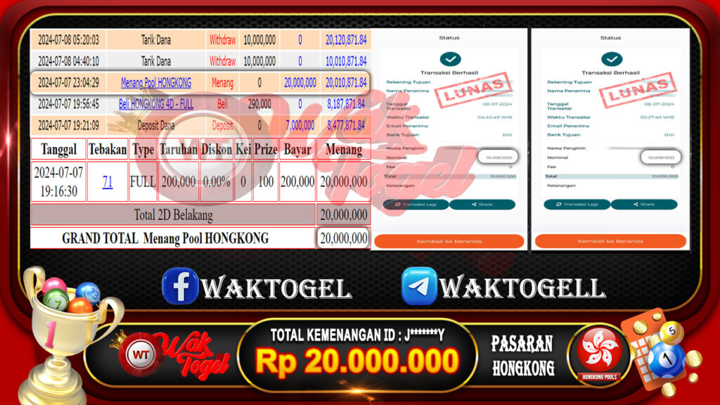BUKTI PEMBAYARAN HONGKONG WAKTOGEL RP. 20.000.000 – GAME : TOGEL HONGKONG POOLS (USER ID : J*******Y) TANGGAL |07-07-2024| CASH LUNAS !
