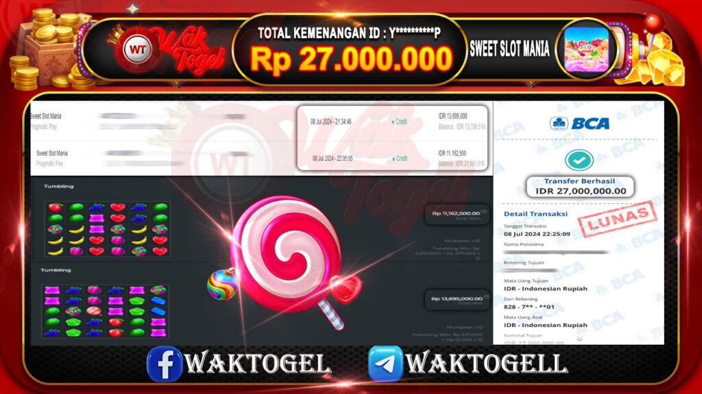 BUKTI PEMBAYARAN SLOT WAKTOGEL RP. 27.000.000 – GAME : SWEET SLOT MANIA (USER ID : Y**********P) TANGGAL |08-07-2024| CASH LUNAS !