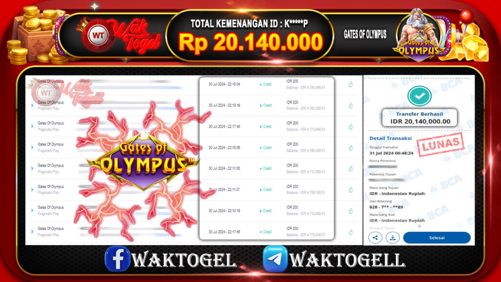BUKTI PEMBAYARAN SLOT WAKTOGEL RP. 20.140.000 – GAME : SLOT GATES OF OLYMPUS (USER ID : K*****P) TANGGAL |30-07-2024| CASH LUNAS !