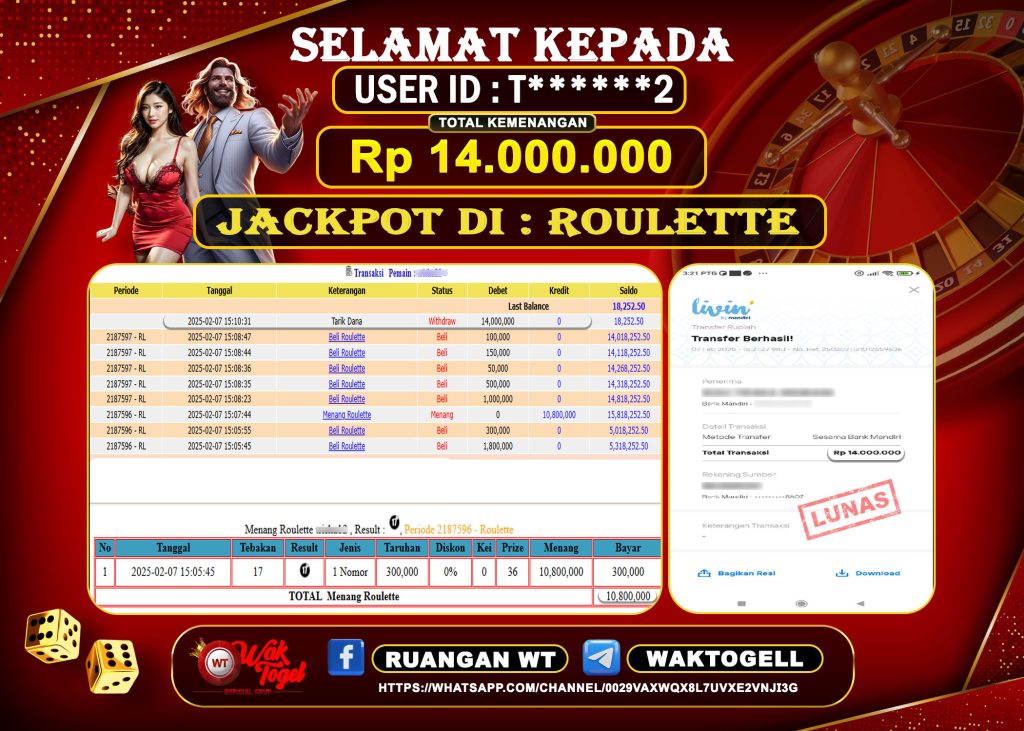 Kami ucapkan selamat kepada user ID : T******2 telah berhasil menang sebesar Rp. 14.000.000 di game : ROULETTE. Bukti pembayaran jackpot member Waktogel kami bayar lunas dengan waktu paling singkat.