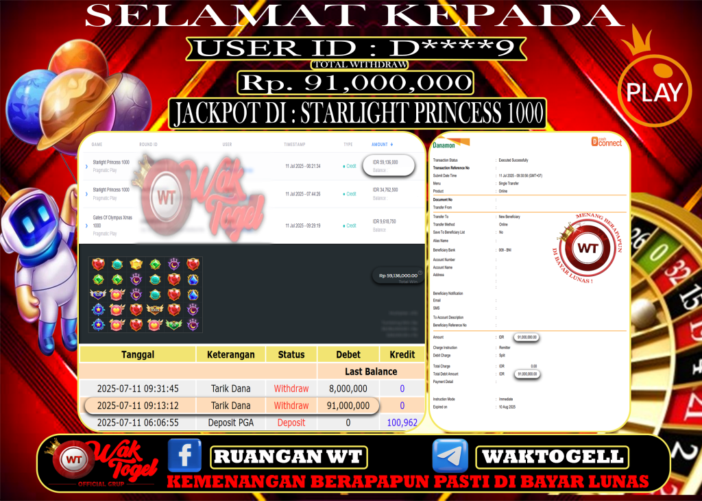 BUKTI PEMBAYARAN SLOT WAKTOGEL RP. 91,000,000 – GAME : SLOT STARLIGHT PRINCESS 1000 (USER ID : D****9)TANGGAL|11-07-2025| CASH LUNAS !